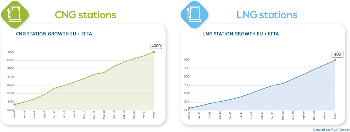 Für die Mobilität mit CNG und LNG – und vor allem ihren fast klimaneutralen Bio-Varianten – ist ein europaweit ausgebautes Tankstellennetz unerlässlich. Dank der auch international permanenten Zunahme der Verwendung von Biomethan als Kraftstoffgrundlage geht es hier forciert voran. 2020 lieferten bereits 25 % dieser Gastankstellen Biomethan, ein Anteil von 17 % am verkauften Kraftstoff. Die NGVA erwartet, dass bis 2030 europaweit 40 % Biomethan zur Verfügung stehen, um die gesamte CNG- und LNG-Flotte aus dann mehr als 13 Mio. Fahrzeugen klimaschonend anzutreiben und so die Treibhausgasemissionen um insgesamt 55 % zu reduzieren. Bis dahin dürften nach NGVA-Schätzung rund 10.000 CNG- und 2.000 LNG-Tankstellen ein engmaschiges Versorgungsnetz sicherstellen. Quelle: Pressemitteilung der NGVA.eu