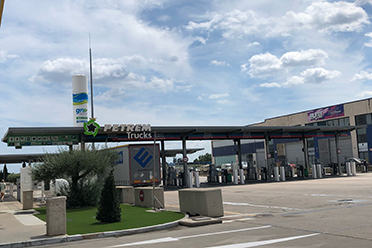 Von der Straße Carrer Corral Roig einfahren, damit man zu den PKW-Tanksäulen kommt. Der gelbe Bezahlautomat ist nicht an den Säulen, sondern nebenan am Gebäude.